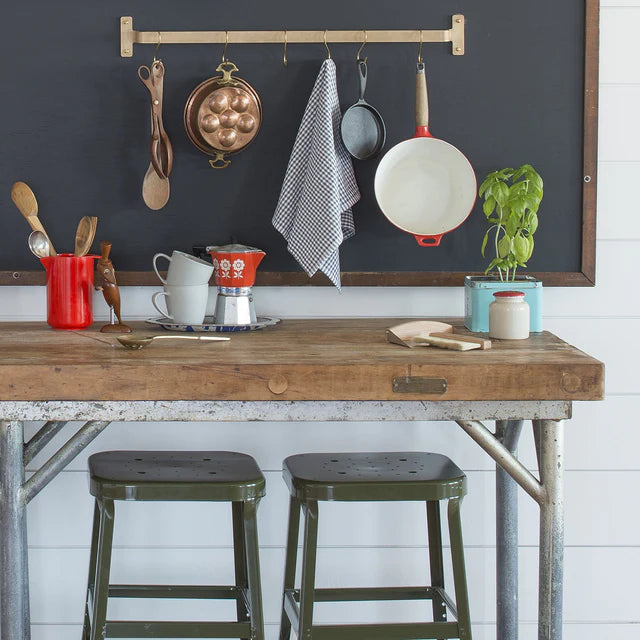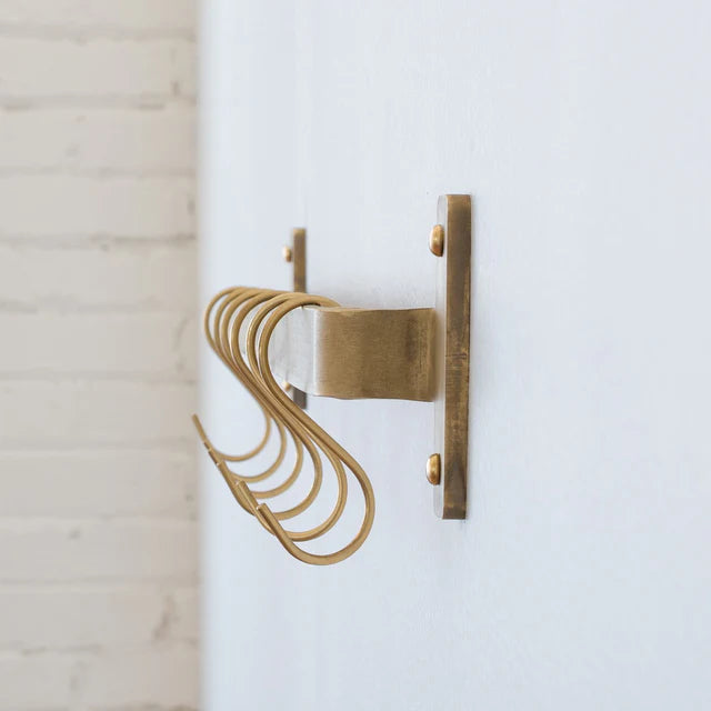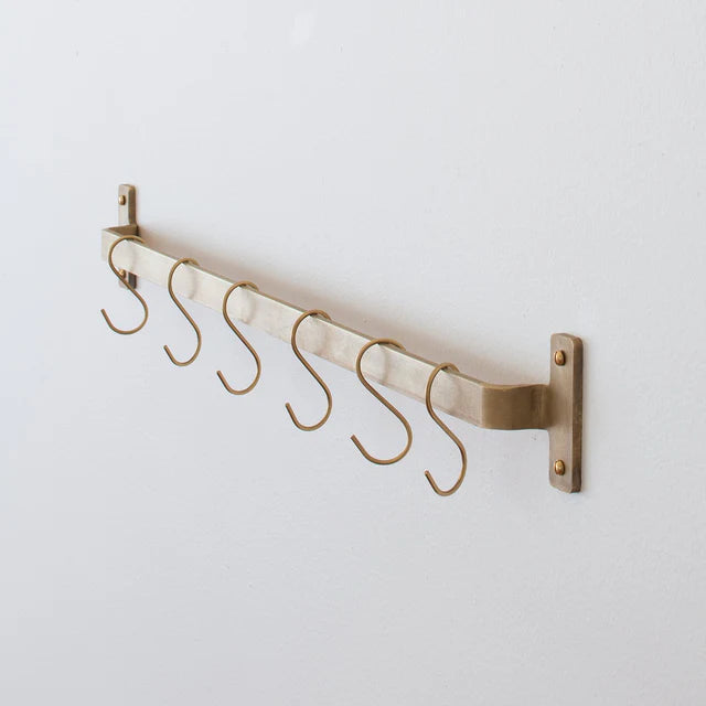 Inspired by industrial kitchens, this durable rail saves space while displaying pots and pans. Featuring a natural brass finish, this solid brass rail combines sophistication with practicality and comes with six brass S-hooks for hanging cookware and tableware. This classic piece is built to last.